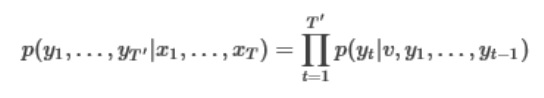 위 식에서 v는 컨텍스트 벡터이며, t시점의 y 단어를 생성하기 위해 t시점 이전의 y와 컨텍스트 벡터가 input으로 들어가는 것을 의미한다. 그리고 p(yt|v, y1, . . . , yt−1) 확률은 softmax를 통해 단어가 나올 확률을 계산한다.