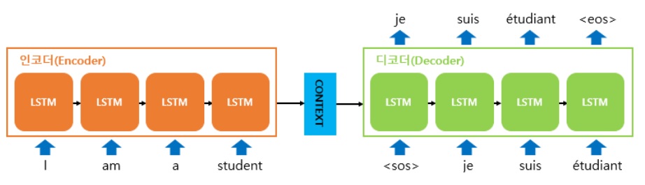 인코더 부분에서는 입력 시퀀스를 LSTM이나 GRU 셀을 이용해서 hidden state로 넘겨주면서, 마지막 단계의 hidden state를 디코더에게 전달한다. 마지막 단계의 hidden state를 컨텍스트 벡터(context vector)라고 하며, 이 정보를 입력 시퀀스, 즉 입력 문장에 대한 압축된 정보라고 생각할 수 있다.